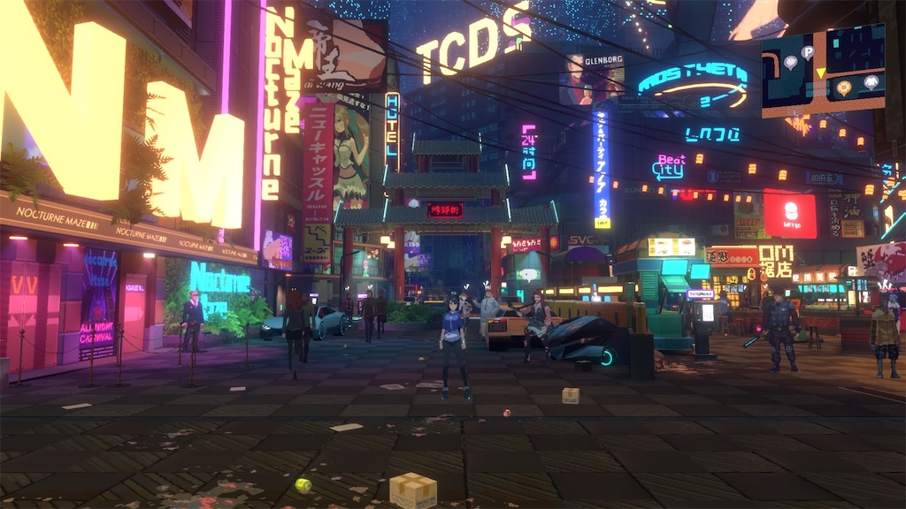 アイドルなどをあちこちに貼りアキバっぽいサイバーパンクを出しつつ写真の門のように中国のエッセンス入れているのがオリジナリティがあるね。