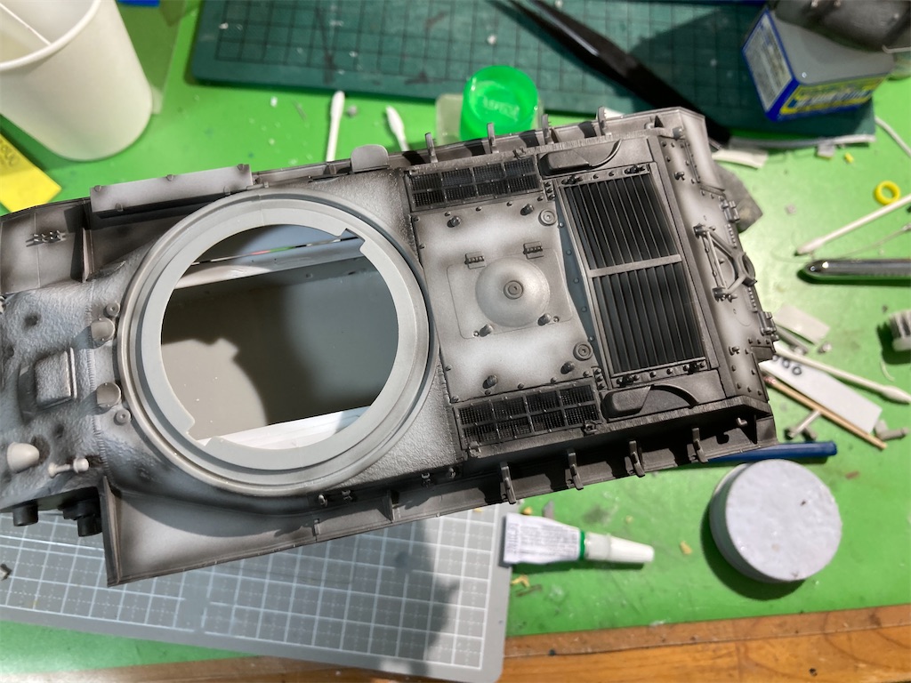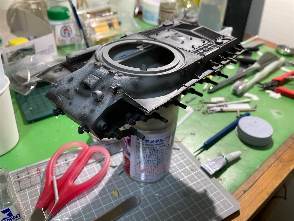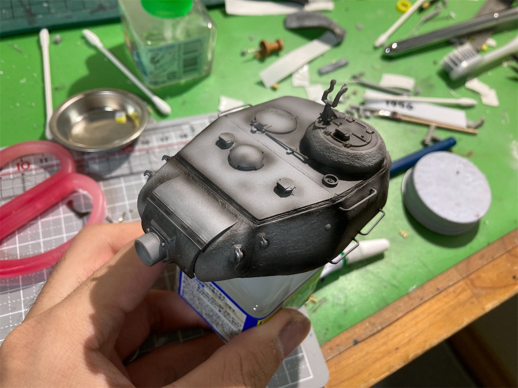 2022-12-23 ドラゴン:JS-2(IS-2)製作 ⑥ プラモデル IS-2 ブログにあげるの忘れてた シャドウ吹き吹き〜 1枚目はふつーに4BOを吹いて2.3枚目は試しにハイライトを入れてみた。 初挑戦だったけど、調色や武器加減が難しいねチッピング入れたいけど細かい筆ないので1/26だったかな?発売のタミヤの極細を買うまで全裸待機 その間バーラム進める