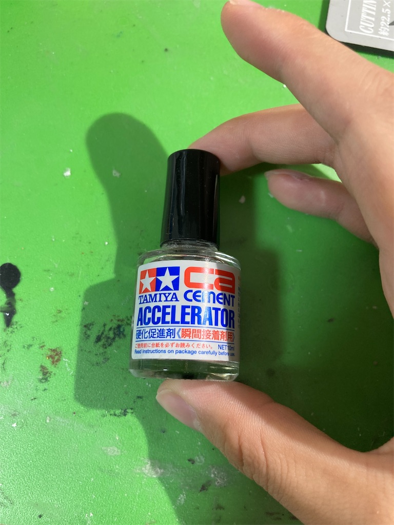 シアノンは硬化が遅く硬化前に流れて盛り付け直後とは違う形になるので瞬着硬化促進剤をオススメする。