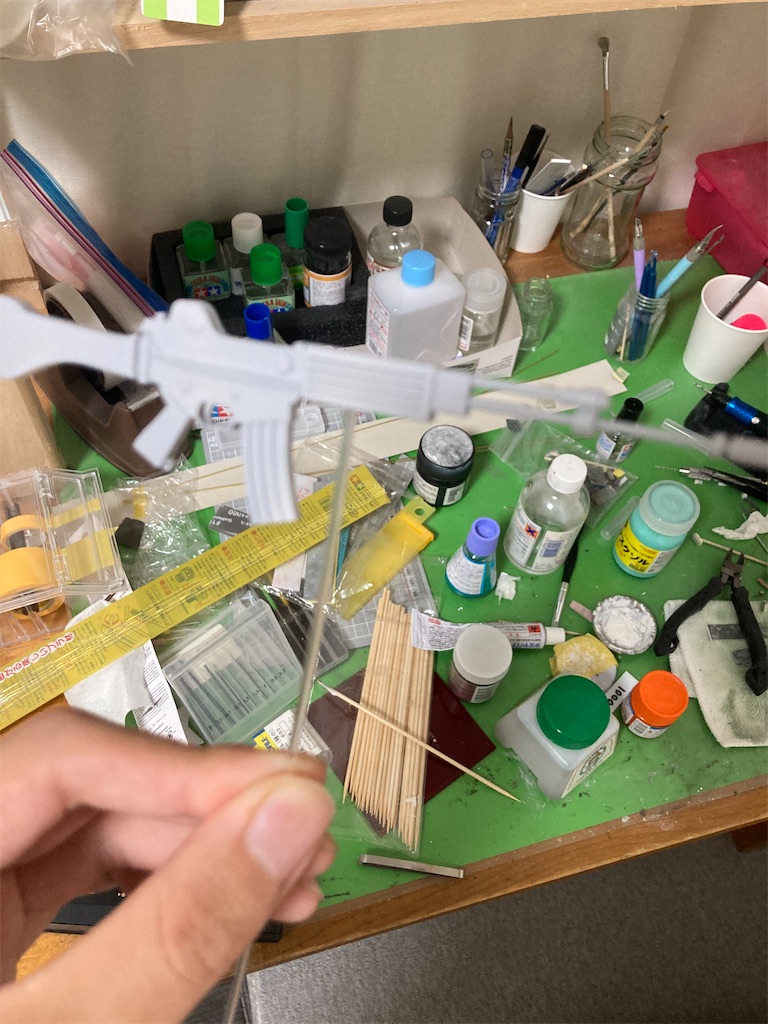 銃を飾る時はこんな感じに透明棒で固定しようかなって思ってる。タミヤの透明棒でしなっしななのをしらなかったけどもつかな..?