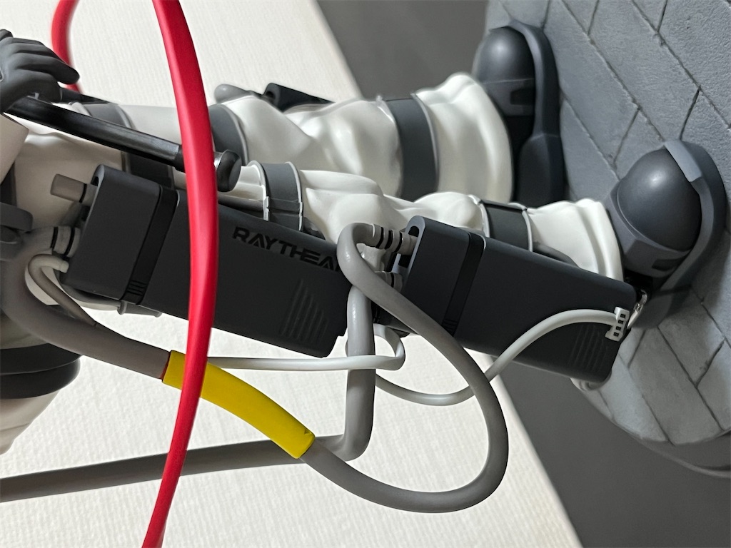 その後上はジャーマングレーとライトよりのグレーで塗り分けて写真には無いが首元や手首の留め具はGXのキアライエロー、足回りの方は外骨格用のベルトをMr.13ニュートラルグレーその縁を若干明るいガイアニュートラルグレー3で塗り分けをした。
